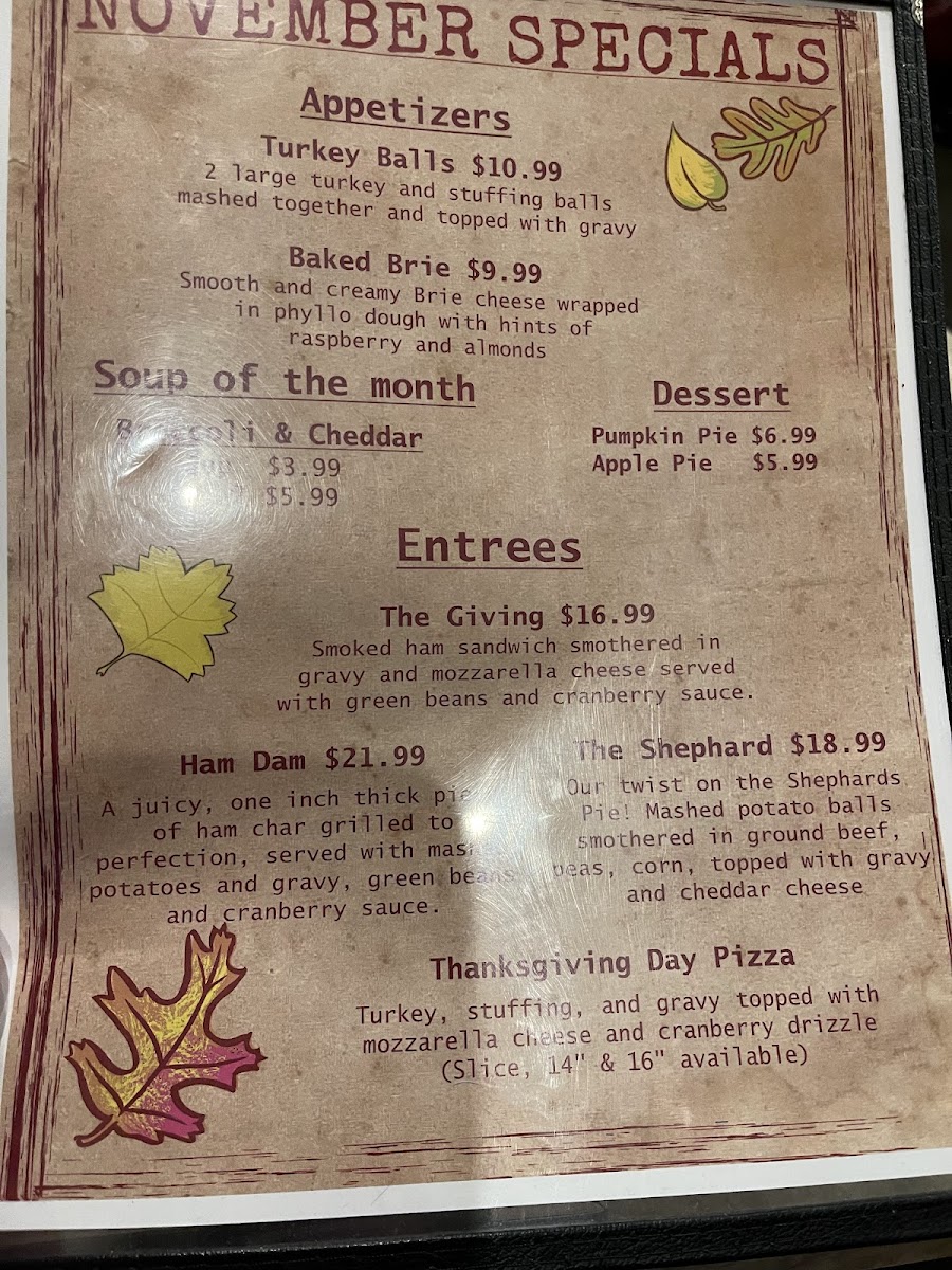 - Appetizers: Don’t miss the sampler platter—a hearty selection of chicken tenders, cheese sticks, and wings for only $10.99.